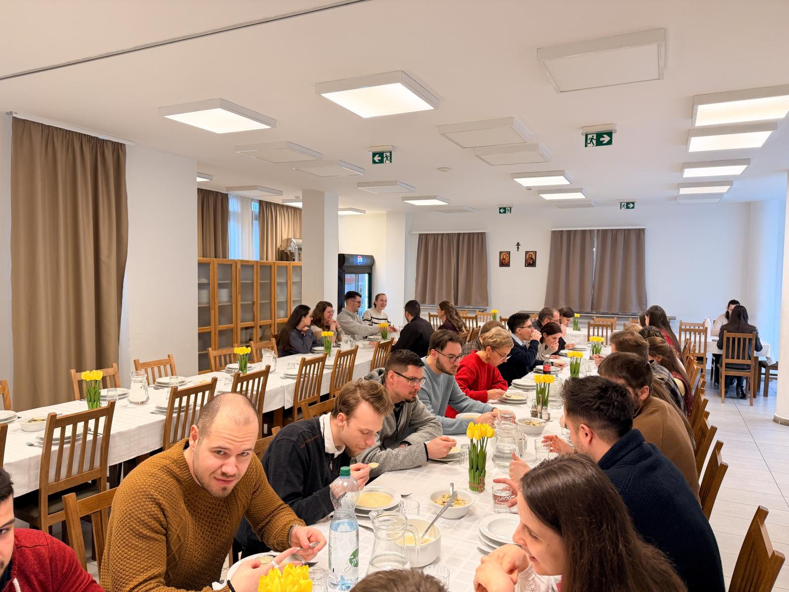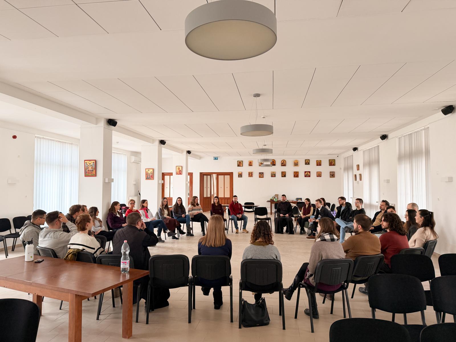 Délután Miklós atya gondolatébresztő kérdéseket tett föl nekünk a változás és változtatás témakörökkel kapcsolatban. A kis csoportokban megoszthattuk tapasztalatainkat. Érdekes volt átelmélkedni azt, hogy mikor van szükségünk arra, hogy változtassunk. Az esti szertartások előtt az általunk húzott szentírási szakaszokról csendben elmélkedhettünk. Az egész hétvége folyamán lehetőségünk volt szentgyónásra és lelki beszélgetésre. Vacsora után az Istenszülő közbenjárását kérve az Akathisztosz himnuszt imádkoztuk el a kegytemplomban. Azt hiszem, mondhatom, hogy valamennyiünk számára mély, közösséget erősítő élmény volt.