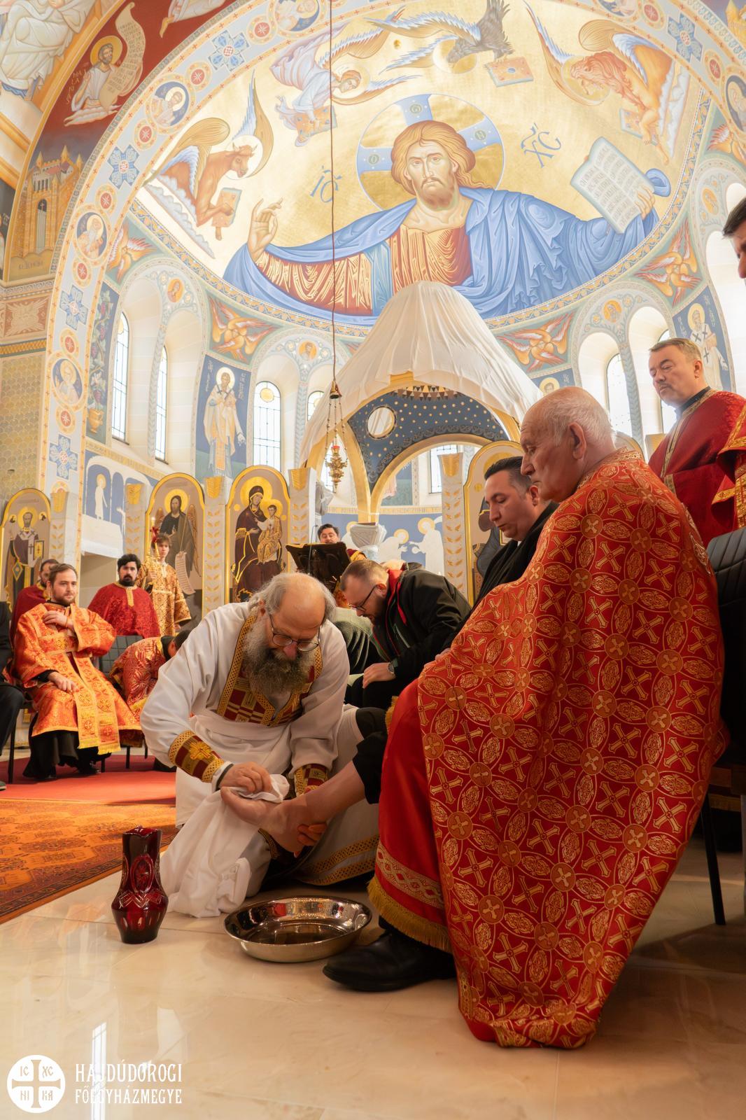 Az ünnepi liturgia végén Fülöp metropolita elvégezte a lábmosás szertartását is. Miközben Nyirán János fődiakónus az Evangélium erről szóló részét olvasta, Fülöp atya Krisztushoz hasonlóan levette felsőruháját, kendőt kötött magára, s kancsóval a kezében megmosta tizenkét férfi lábát. A „tanítványok” között kántorok, a debreceni parókia több híve, papnövendék, ministráns és diakónus is helyet foglalt.