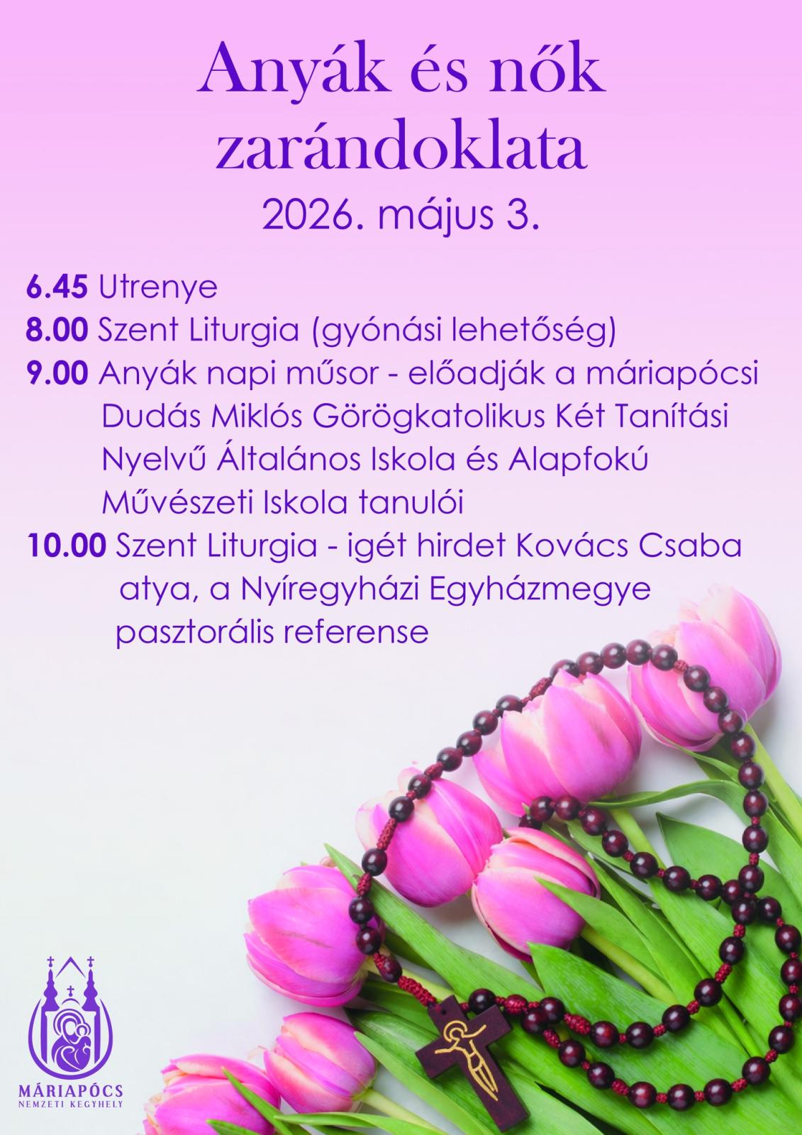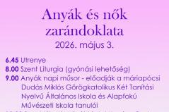9:00 Anyák napi műsor. Előadják a máriapócsi Dudás Miklós Görögkatolikus Két Tanítási Nyelvű Általános Iskola és Alapfokú Művészeti Iskola tanulói.