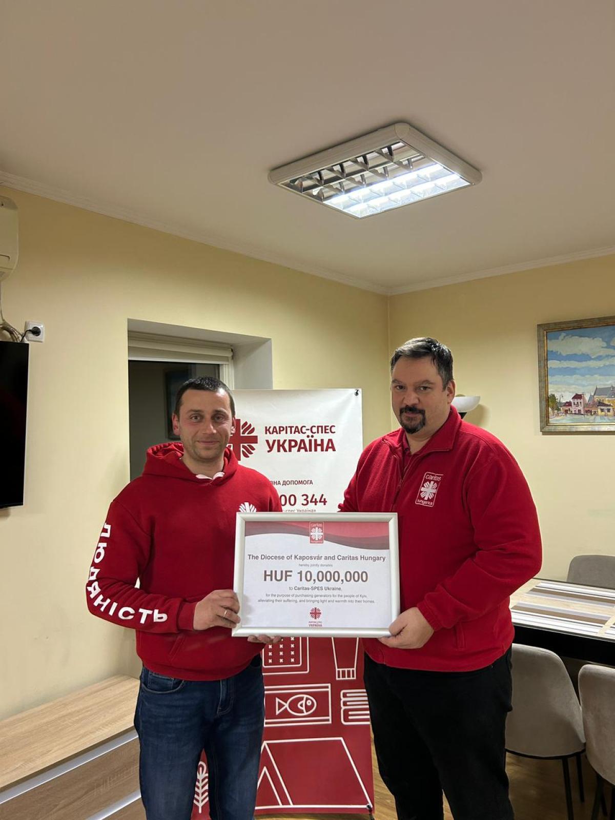 A támogatás a mai napon átadásra került Lemberben (Lviv) az ukrán Katolikus Karitász (Caritas-Spes) munkatársai számára, hogy azonnal eljuthasson a leginkább rászorulók részére, főként Kijevbe (Kyiv). Az átadás során Zagyva Richárd országos igazgató kiemelte: „Óriási jelentősége van egy ilyen összefogásnak. A magyar adományozók néhány nap alatt olyan nagy összeggel segítettek, hogy azt már itt, Ukrajnában át is tudtuk adni, áramfejlesztőkkel kiegészítve. Így a támogatás különösen gyorsan megérkezhetett: a dermesztő, fagypont alatti hidegben áram és víz nélkül maradt családoknak és idős embereknek azonnali segítséget és reményt jelentett. Köszönjük mindenkinek, aki részt vett benne.”