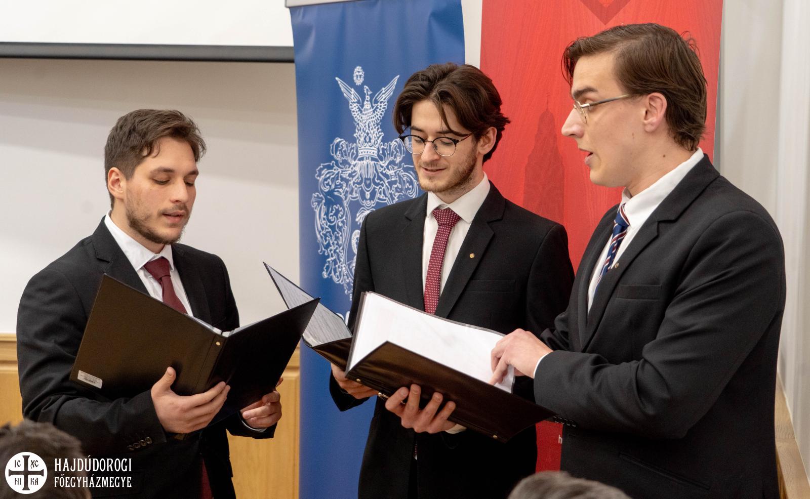 Ezután a görögkatolikus kispapok kórusa énekelt. Kalász Nándor, Erdei Ákos és Koszta János jóvoltából a görögkatolikus utrenye szertartásból hallhattuk az Istenszülőt magasztaló éneket görög nyelven.