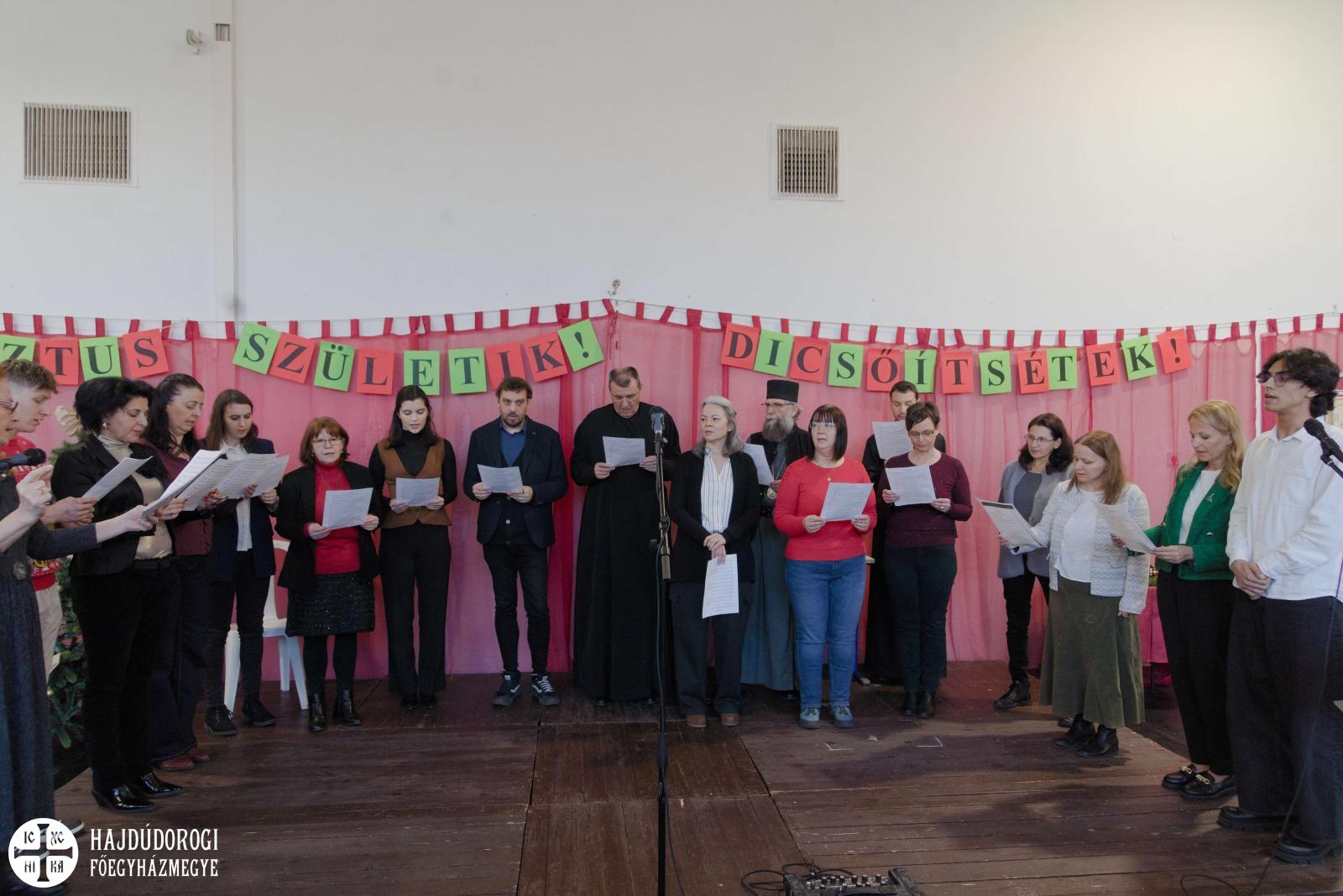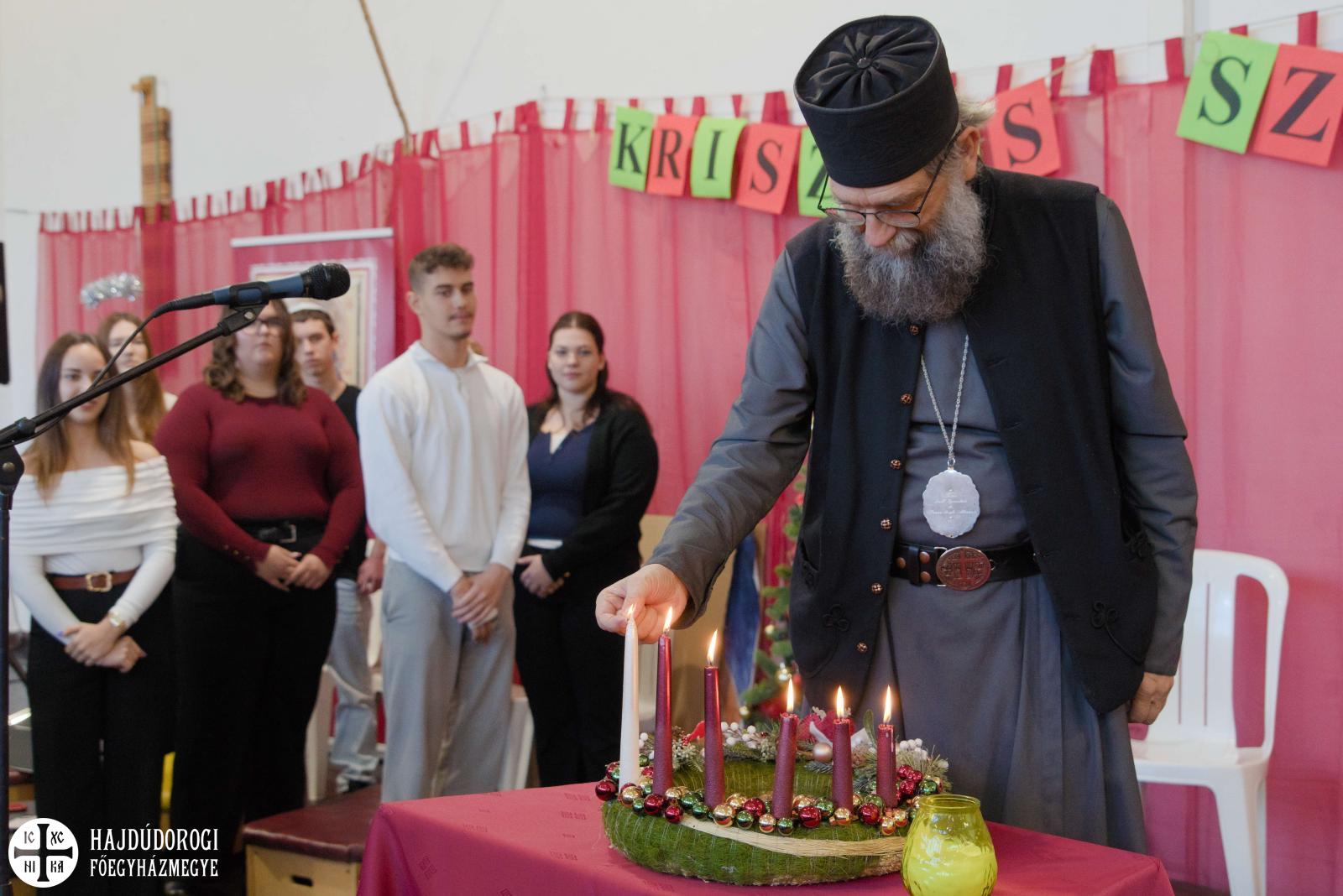 Az ünnepség kezdetén karácsonyi katavásziákat énekeltek a jelenlévő pedagógusok, tanulók Kocsis Fülöp metropolitával és az intézmény két egyházi szolgálattevőjével, Szilágyi Gábor és Papp András atyával közösen. Ezután Fülöp atya gyújtotta meg az utolsó gyertyát is az adventi koszorún.