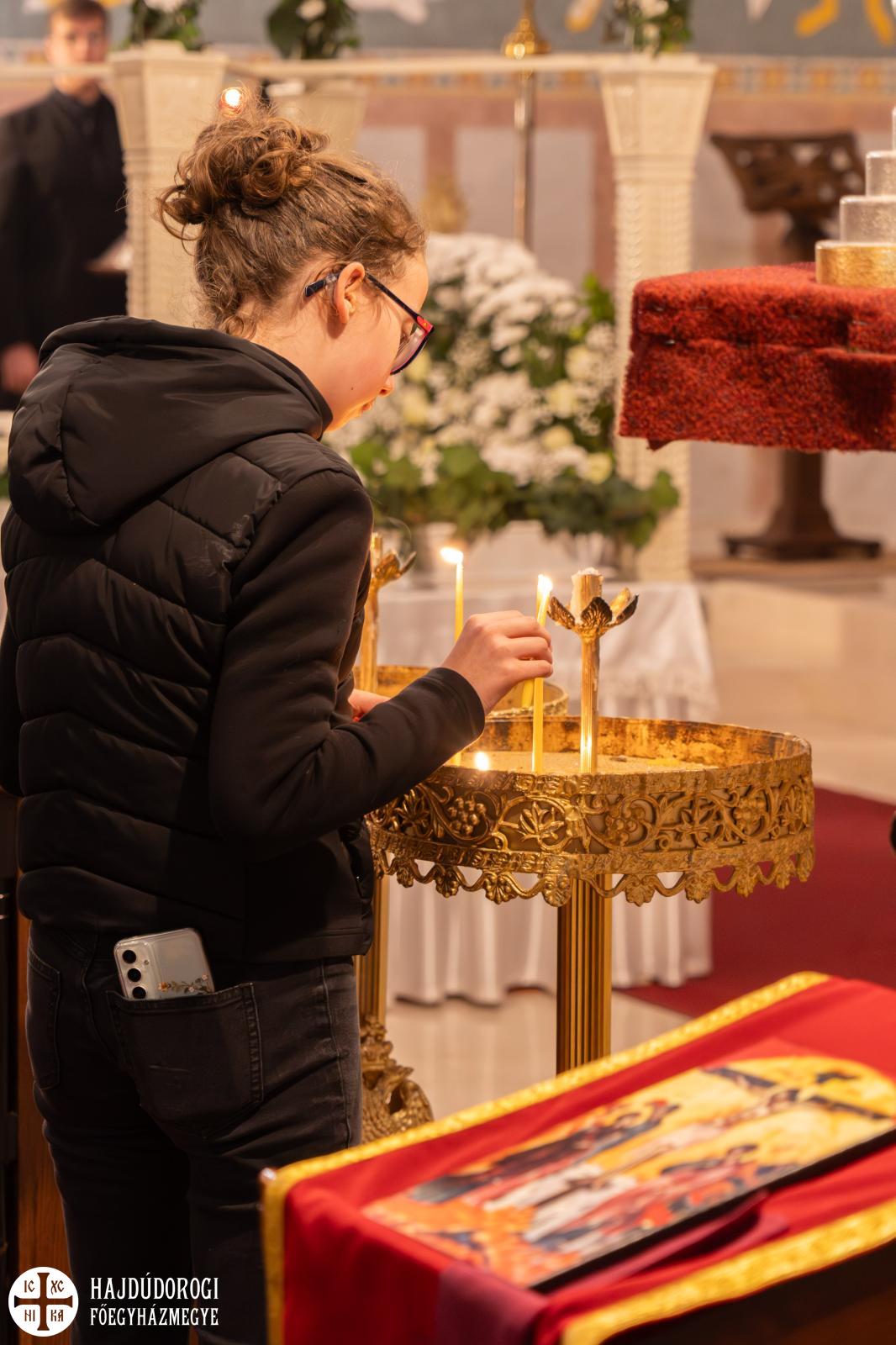 A vecsernye végéhez közeledve a papság magasba emelte a síri leplet, majd a kezükben égő gyertyát tartó hívek kíséretében mindannyian elindultunk a sír felé.