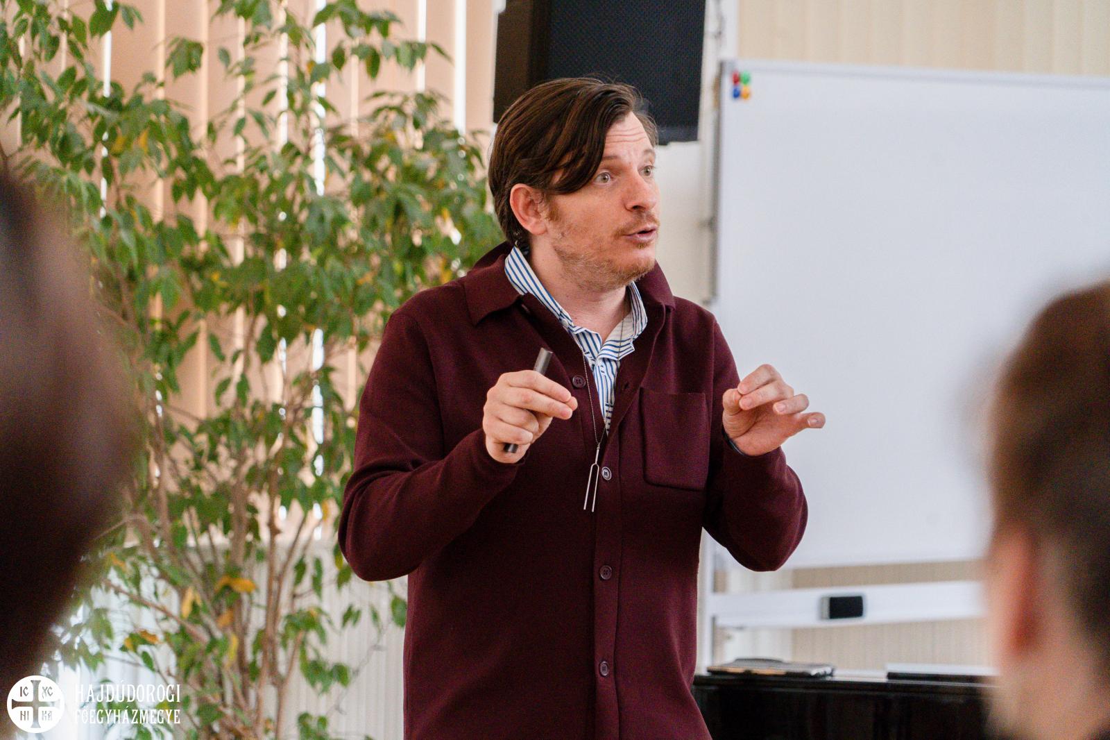 A nap előadója, Dr. Tóth Árpád, a Partiumi Keresztény Egyetem Művészeti kar és a Nemzeti Közszolgálati Egyetem adjunktusa volt. A 2x80 perces foglalkozás korántsem a klasszikus értelemben vett előadást jelentett. Árpád bemelegítő gyakorlatokat, ritmusjátékokat és ezekhez használható dallamokat mutatott a jelenlévőknek. Kiemelte: kevés eszközzel jól bánni fontosabb, mint egy drága hangszerekkel felszerelt zeneterem. Ennek alátámasztására dobogásra, tapsra és mozgásra épített feladatokat hozott, hiszen a zeneiség megtalálásához, a „belső” lüktetés fejlesztéséhez a vonat zakatolása, az evőpálcikák összekoccanása, végtagjaink mozgása is segíthet.