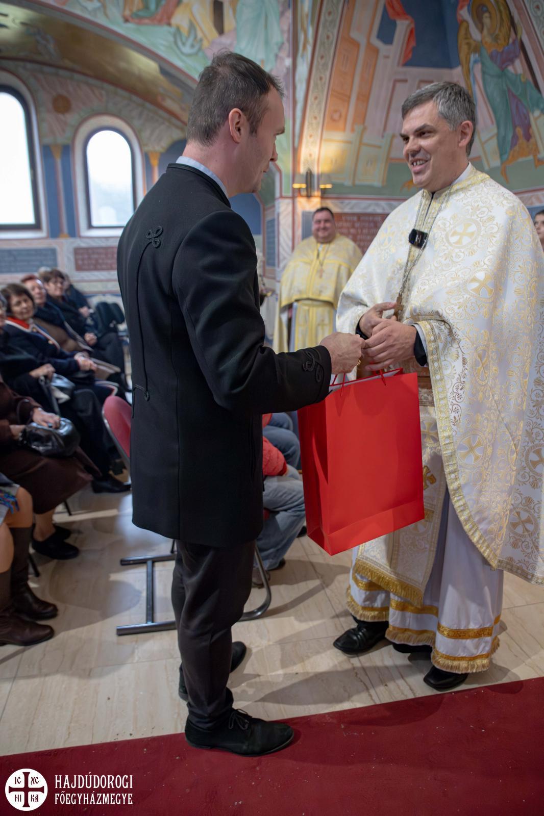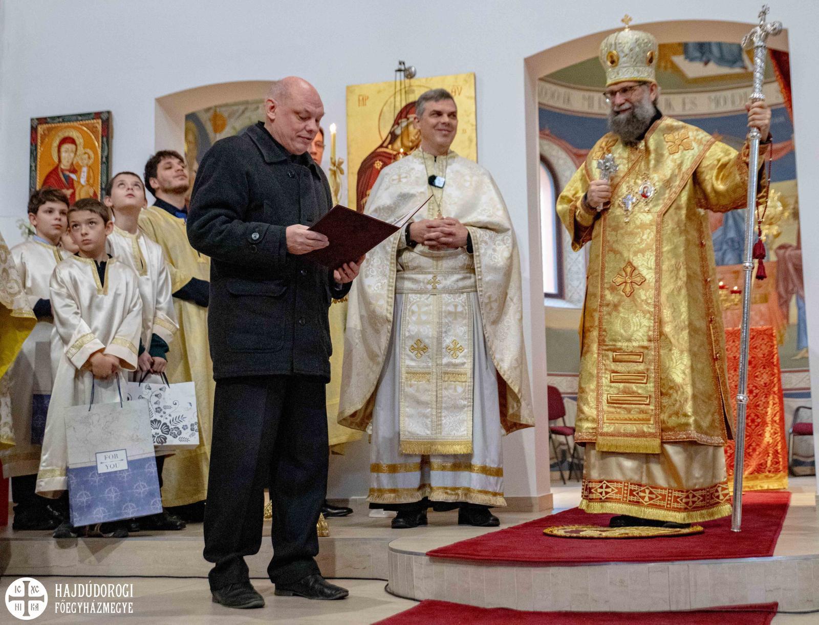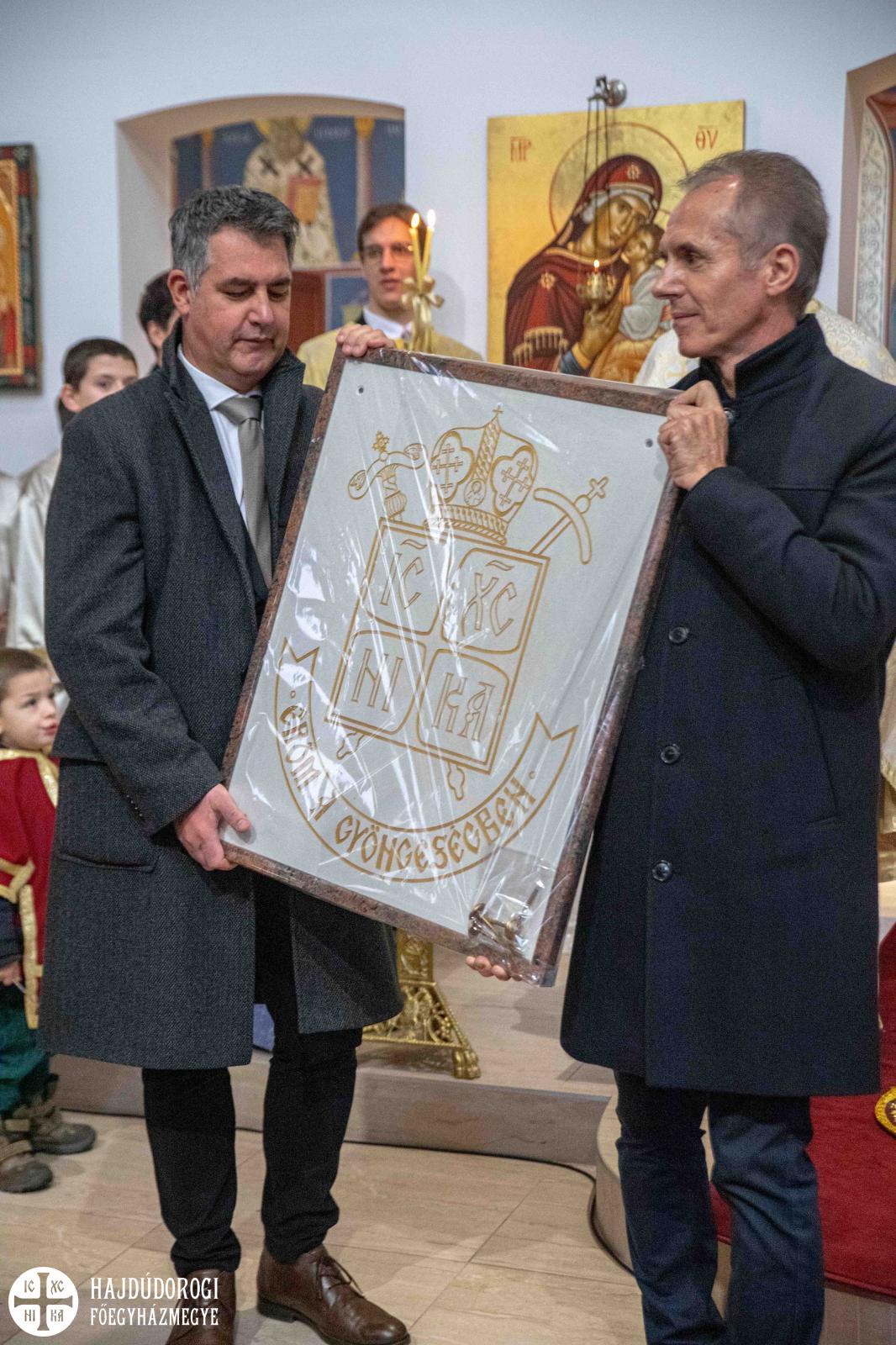 Jaczkó Dániel parókus hálát adott azoknak, akik hozzájárultak a belső falfestés megvalósulásához. Méltatta Fülöp metropolita gondos irányítását és kitartó jelenlétét, amely az első ecsetvonástól az utolsóig kísérte a folyamatot. A parókus hálájának jeléül ünnepélyesen átadta a közösség ajándékát: a püspöki címert – ünnepi kivitelben.